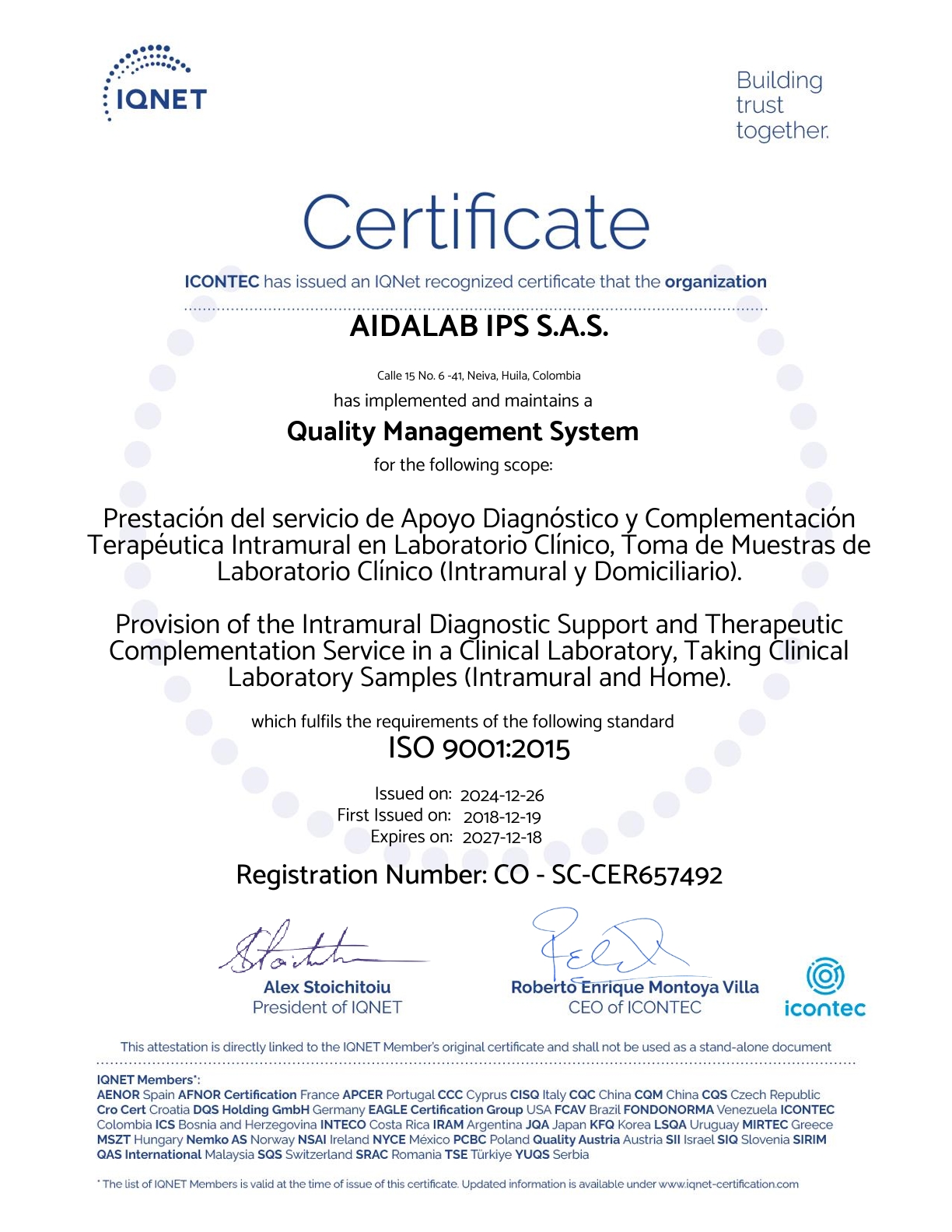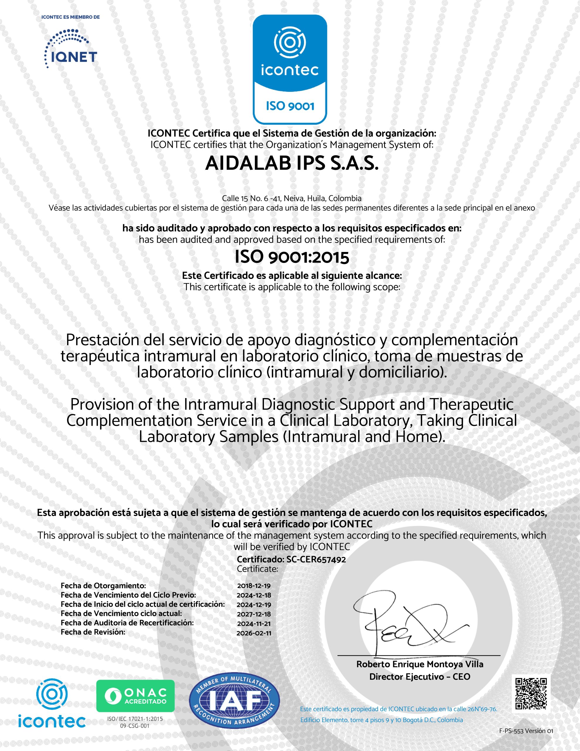 Nuestras sedes de Neiva y Pitalito cuentan con la certificación Icontec e IQNET, que evidencian el cumplimiento de altos estándares de calidad en los servicios de tomas de muestras de laboratorio clínico y sus respectivos procesamientos de pruebas.